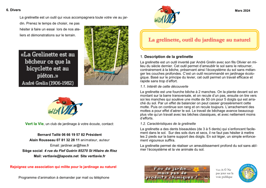 Alain Rousseau a une longue expérience en jardinage (ex JDF : Jardiniers de France, siège social à Valenciennes) en Loire-Atlantique vers la commune de La Montagne (fondateur de l’association Jardiner au Naturel, voir (1) Facebook) et désormais à Saint-Hilaire-de-Riez. Lisez ses nombreux dépliants et fiches ci-dessous dont il veut bien nous faire bénéficier.